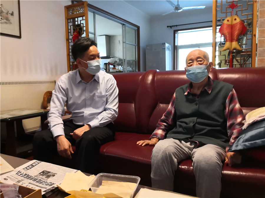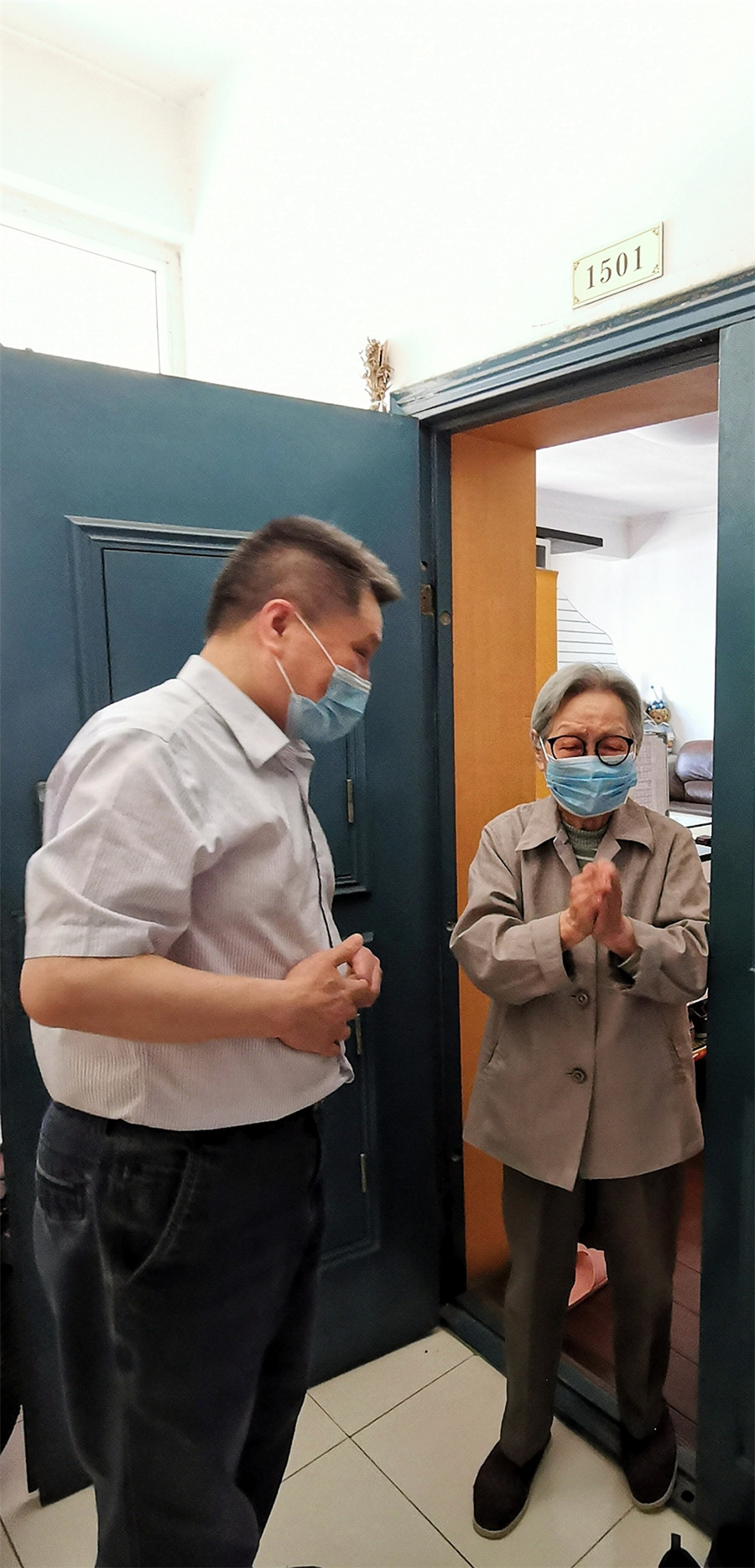 疫情期间,省局91岁离休老干部蒋玲的女儿女婿不幸被确诊感染了新冠病毒。老人体弱多病,被迫独居在家,生活、健康和心理状况等都让人担忧。省局党组对此十分挂怀,要求采取有效措施,确保老干部安全。当时正处在抗击疫情关键时期,社区工作千头万绪,事务庞杂,处于透支状态。但他们得知情况后,毫不推辞,当即登门探望,并制定了“三个每日,一揽全包”的整体帮扶方案,即:坚持每日上门、每日记录、每日反馈,老人的防疫消毒、生活日需、求医用药、心理疏导社区全包。
