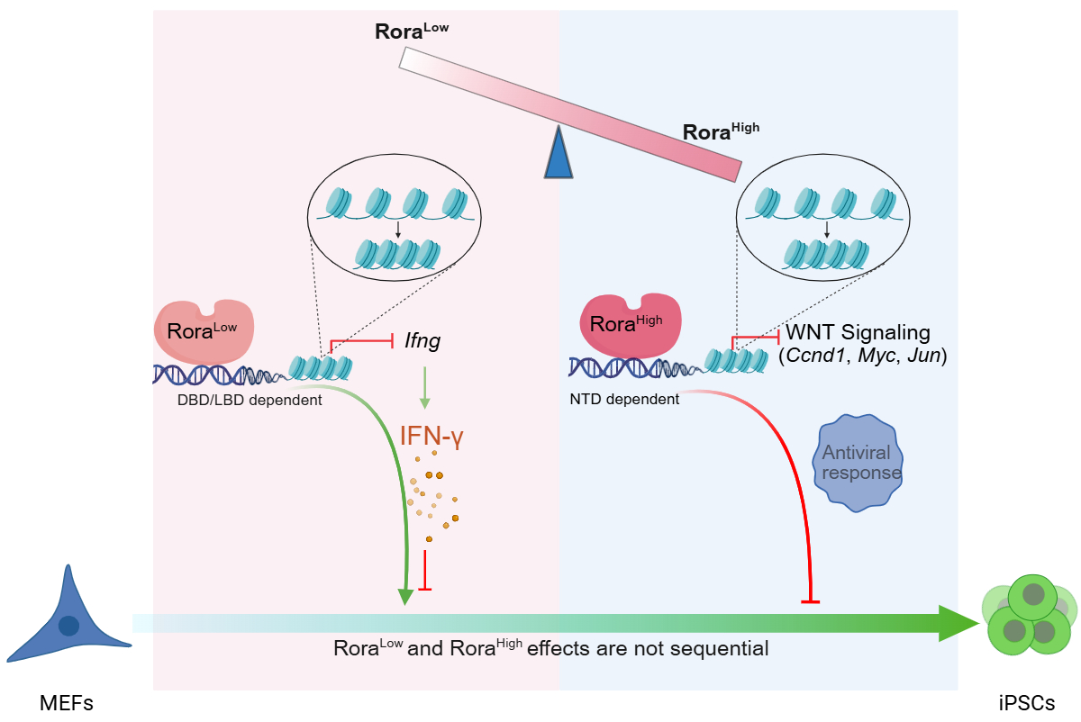 研究团队进一步展开了Rora的结构和功能研究。通过结构域拆分,发现DNA结合结构域(DBD)与配体结合结构域(LBD)是Rora发挥促进功能所必需,而N端结构域(NTD)则是介导高剂量下的抑制效应的关键区域。在机制层面,研究团队通过整合RNA-seq、CUT&Tag、ATAC-seq、IP-MS多组学数据,提出如下模型:低剂量下,Rora通过削弱IFN-γ相关免疫信号促进重编程;高剂量下,Rora通过抑制WNT通路输出造成重编程效率下降。该模型为理解Rora的剂量效应提供了机制线索。