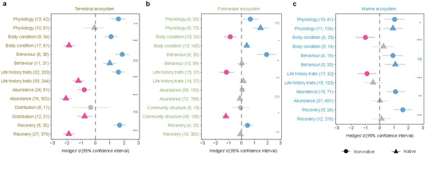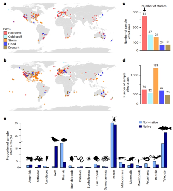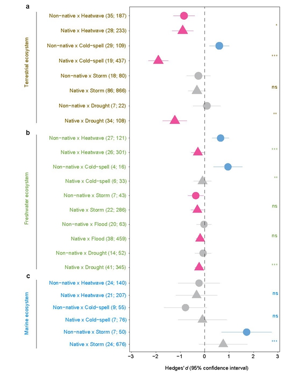 外来物种入侵和气候变化是全球生物多样性的重大威胁,探讨两者间互作过程和联合风险对制定外来种防控和本土种保护策略至为关键。需要特别指出的是,气候变化不仅指平均温度或降水的改变,近年来频次和强度都不断增加的极端天气事件(如热浪、寒潮、风暴、洪水和干旱等)已成为气候变化的重要形式,受到学界和公众的广泛关注。虽然围绕本土物种和外来物种对各类极端天气的生态、行为和进化响应已开展了大量研究,但至今尚未得出不同动物类群在不同极端天气作用下的普适性规律。前期基于外来物种入侵成功机制的研究发现,外来物种通常能快速适应新环境下的选择压力,表现出比本土物种更高的表型可塑性;同时,在干扰生境中本土物种的种群数量下降甚至区域灭绝会为外来物种创造更多的空缺生态位以促其入侵;而且,相比本土物种,外来物种通常具有更快的生长速度、更强的竞争能力和更好的种群恢复力。因此,理论上外来物种与本土物种在面对极端天气时可能会表现出更低的敏感性,但该理论假设从未在全球尺度、跨越陆地、淡水和海洋不同生态系统、覆盖不同极端天气类型和响应指标、在不同动物类群和生物地理区系中得到综合性的验证。
