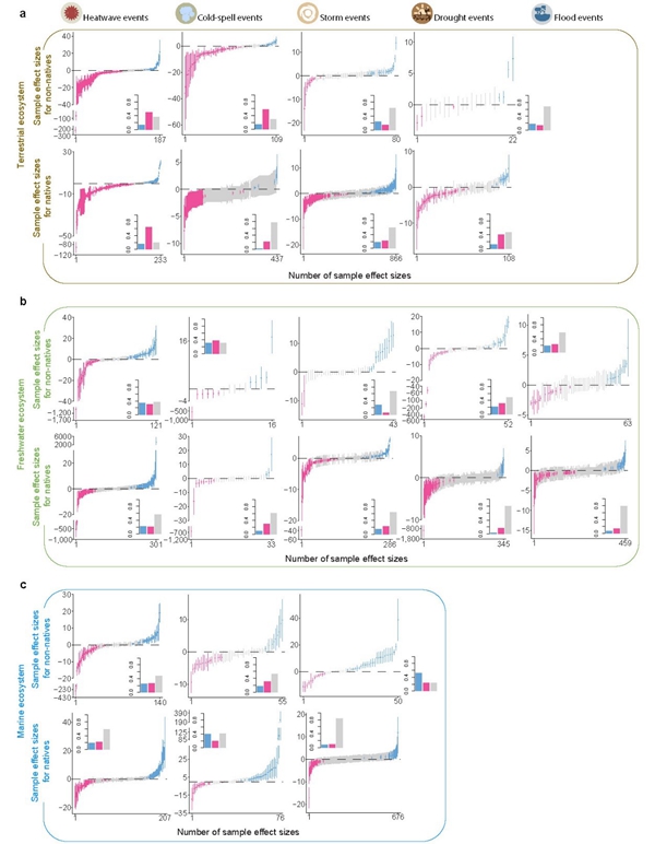 但该整体响应差异可能仅反映了外来种和本土种的研究样本在不同动物类群、不同生态系统类型、不同生物地理区系、不同极端天气事件及不同响应指标中的分布差异。为此,团队进一步应用多水平混合效应整合回归分析,在控制不同情景下的样本偏倚和变量间交互效应基础上,更加精细的量化了外来动物和本土动物对极端天气的响应差异。研究结果仍然支持我们的理论预测:整体上,外来动物对极端天气的弱敏感性普遍存在于陆地、淡水和海洋生态系统;在不同极端天气类型层面,仅有外来陆生动物对热浪事件、外来淡水动物对风暴事件表现为负响应,而本土陆生动物对热浪、寒潮、干旱,本土淡水动物对热浪、风暴、洪水和干旱均表现出负响应,海洋动物中除本土贝类和珊瑚对热浪呈现负响应外,其他外来和本土类群对各类极端天气均不敏感(图3)。