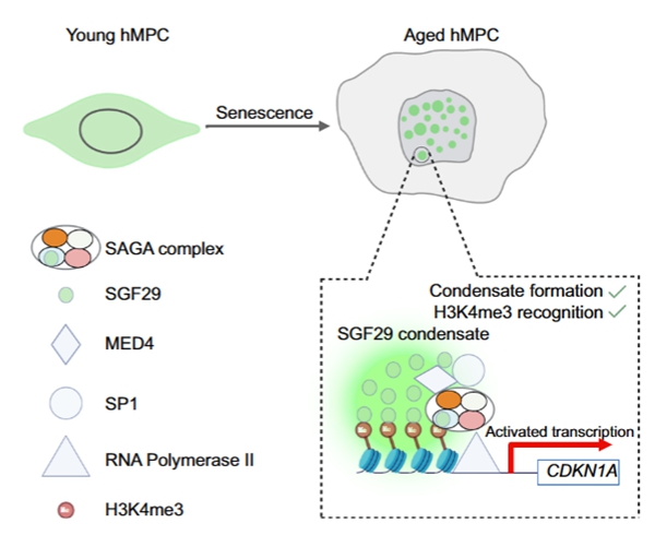 2023年11月7日,中国科学院动物研究所刘光慧研究组、曲静研究组和中国科学院北京基因组研究所张维绮课题组合作在Cell Discovery在线发表了题为SGF29 nuclear condensates reinforce cellular aging的研究论文。该研究首次阐明了液-液相分离调控细胞衰老的分子事件,发现转录调节蛋白SGF29通过相分离招募转录机器形成蛋白凝聚体,介导细胞周期阻滞蛋白p21Cip1(由CDKN1A基因编码)表达,从而诱导细胞衰老。