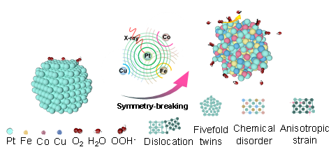 针对上述瓶颈,本研究提出了一种对称性破缺调控策略,通过构建PtFeCoCu多组分合金,在原子尺度引入配位不均一和各向异性应变,实现对铂活性位点电子结构的精准调控,从而显著提升氧还原活性与耐久性。研究结合原位谱学与理论计算,系统揭示了对称性破缺在促进反应中间体转化及抑制金属溶解中的关键作用,并建立了从结构到性能的清晰关联。该策略突破了传统合金设计中有序结构的限制,为开发兼具高活性与高稳定性的燃料电池催化剂提供了新思路。