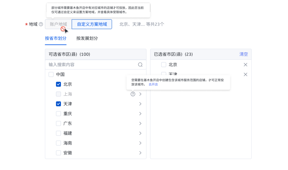 1.在新建和编辑方案设置【地域】时,需校验账户基木鱼开店端是否具备试点城市,即上海市和广州市的本地店铺,具备则可投放该试点城市,不具备则不可投放该试点城市;