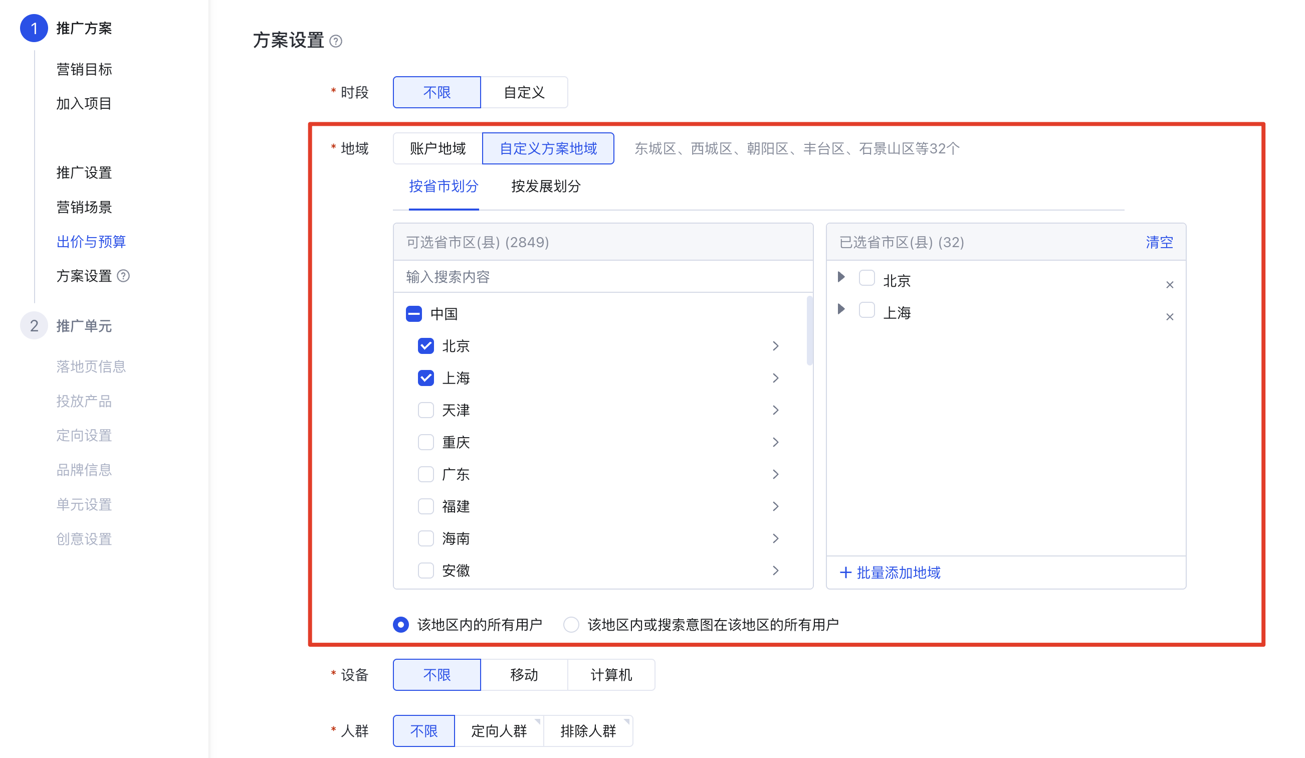 在新建/编辑营销目标为销售线索、网站链接和本地店铺推广的方案时,仅可使用自定义方案地域(不可选择账户地域),并自动代入您账户地域里符合要求的地域。您也可以在地域列表的可选区看到具体受限的城市(目前为上海和广州)