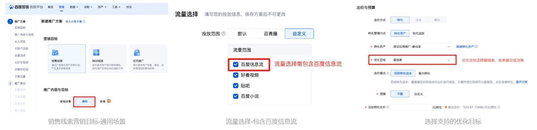 创建销售线索营销目标方案,营销场景选择【通用】,优化目标支持选择表单提交成功、留线索、综合线索收集、有效咨询、聊到相关业务、电话拨通、微信加粉成功、授信,投放范围需包含自定义流量中的百度信息流流量;