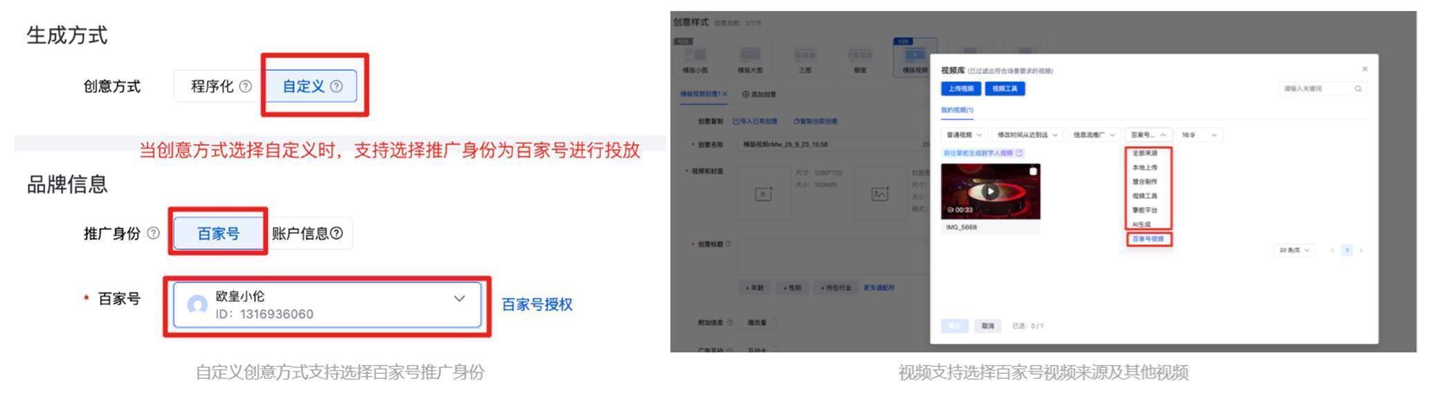 当创意方式设置自定义创意时,支持设置推广身份为百家号,选择已授权百家号进行投放;选择视频来源,支持选择百家号视频来源及其他视频来源;