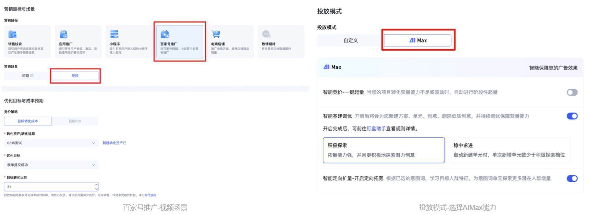 新建项目时,选择百家号推广营销目标-视频营销场景,投放模式支持设置为AIMax模式,可开启智能竞价-一键起量、智能基建调优、智能定向扩量能力。