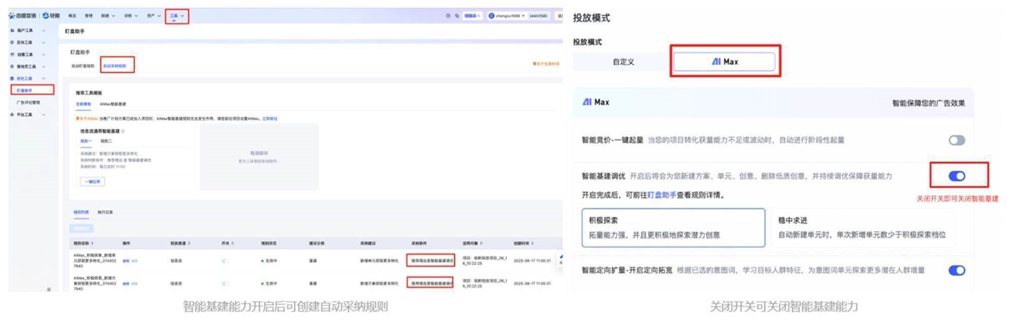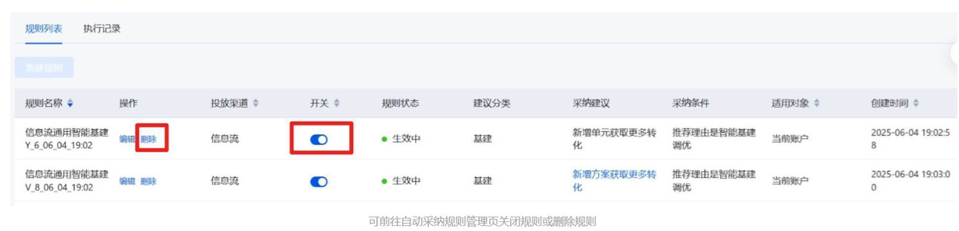 开启智能基建调优能力后,自动生成两条自动采纳规则,系统会自动为您基建计划&单元&创意,如需关闭智能基建的功能,可关闭智能基建开关,也可以前往自动采纳规则关闭规则开关或删除规则;