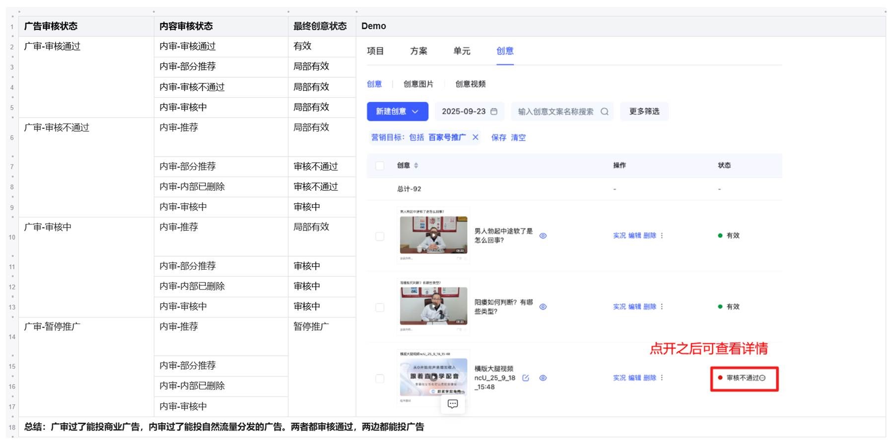 ②操作流程:创意->管理列表页->状态