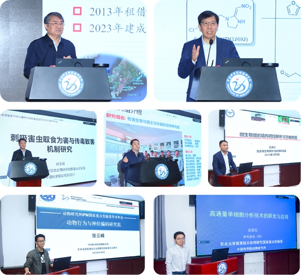 左上:学术委员吴孔明院士作大会特邀报告 右上:学术委员钱旭红院士作大会特邀报告 左中:实验室孙玉诚研究员作学术报告 中:实验室陈金锋研究员作学术报告 右中:实验室王关红研究员作学术报告 左下:实验室张云峰研究员作学术报告 右下:实验室金坚石研究员作学术报告