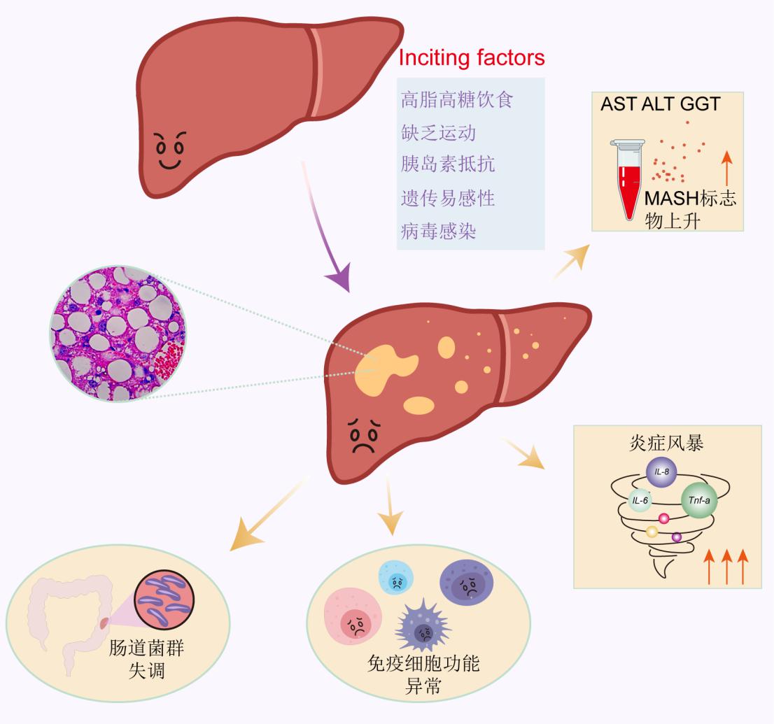 现代人生活节奏快,饮食结构日益高脂高糖,脂肪肝的发病率也逐年升高,已经成为最主要的慢性非传染性疾病之一。这是一种常见的代谢问题,与饮食、运动习惯、体重密切相关。肝脏细胞脂肪变性比例超过5%的病理状态被称为脂肪肝Wu H, Chen J, Guo S, et al. Advances in the acting mechanism and treatment of gut microbiota in metabolic dysfunction-associated steatotic liver disease. Gut Microbes. 2025;17(1):2500099.。很多人虽在体检中被告知有脂肪肝,却认为没有症状就不用担心,但实际上,肝脏不仅是代谢中心,也是一个重要的免疫器官,其中有丰富的免疫细胞,帮助维持身体健康Pham UNT, Chou KC, Ngo TL, Pan WY, Ruan T, Lin YJ. Targeted immunomodulation with H2-generating nanostructures to mitigate obesity-induced inflammation and metabolic dysfunctions. Biomaterials. 2026;325:123570.。脂肪肝会影响你的免疫系统,让你更易患病,恢复更慢,甚至增加严重疾病的风险。
