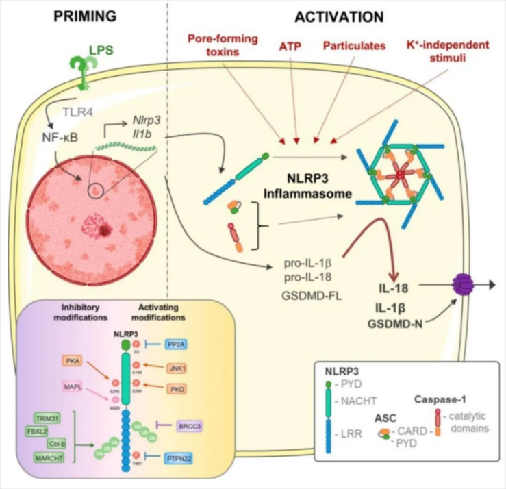 NLRP3炎症小体是一个受到威胁时,在细胞质内临时组装起来的蛋白质复合物,其触发需要经历多重步骤: