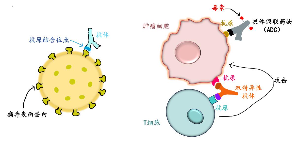 图1:不同类型的抗体“导弹”精准靶向病毒和肿瘤细胞