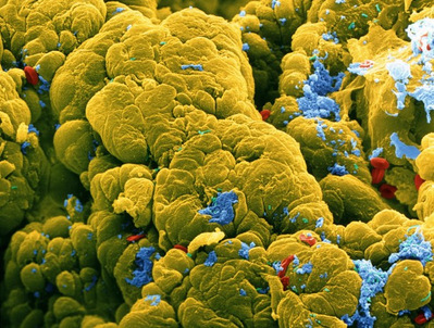 图1 肠道菌群与宿主肠道粘膜的共生(黄色为肠道粘膜,其余颜色代表共生细菌),(引用自美国时代周刊)
