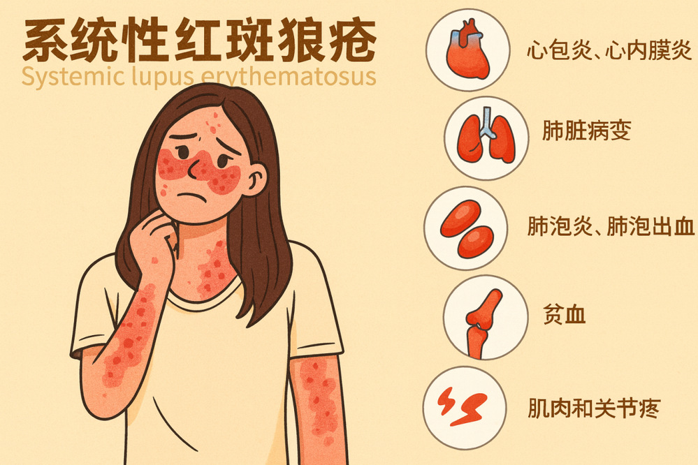 除皮肤受损外,系统性红斑狼疮还可能导致机体其他系统的损伤,一些内部器官的伤害需要医学检查才能发现和确认。例如,患者常在手指、手腕、膝关节等部位出现对称性关节肿痛。随着疾病进展,可能出现蛋白尿、血尿、管型尿、身体水肿等肾脏损伤症状。此外,患者可能出现白细胞、血小板减少,或贫血等造血系统症状,甚至患上纤维蛋白性或渗出性心包炎等循环系统病变。部分患者甚至会出现神经精神症状,如头痛、情绪障碍、认知障碍、癫痫,精神病和多发性神经病变等,也被称为狼疮脑病。总之,我们对SLE的理解不应局限于单纯的“皮肤炎症”,而是机体在免疫动态平衡丧失后逐渐发展成为的一套复杂的系统性连锁反。