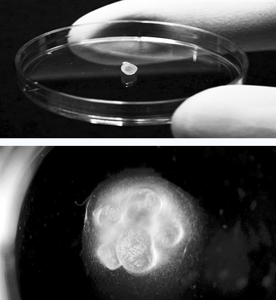 实验室中利用干细胞培育出的“迷你大脑”(上)和类胃器官(下)。 图片来自网络