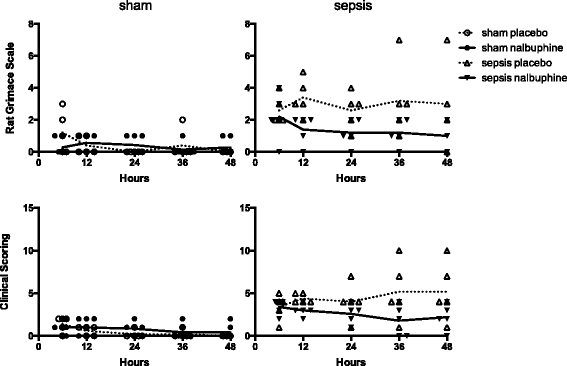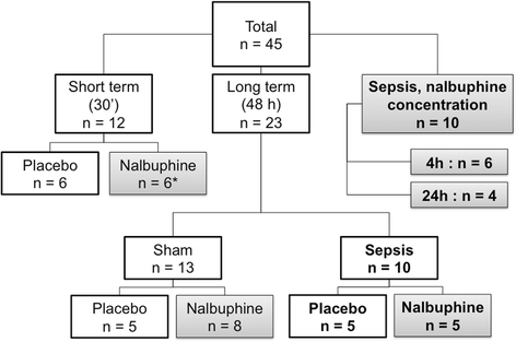摘要:脓毒症研究依赖于动物模型,探讨相关的宿主对感染的反应机制。根据3Rs原则,动物福利要求使用强效镇痛剂来改进现有的败血症模型。然而,适当的镇痛常常是缺失的,部分原因是因为在这种特殊情况下止痛药的作用是未知的。在实验性脓毒症大鼠和非实验性脓毒症大鼠上评估了纳布啡的使用。方法:雄性Wistar大鼠用异氟烷麻醉,静脉输注给药。非感染性动物的短期实验,进行动脉插管可测量血压和采血。纳布啡(或安慰剂)静脉给药,剂量为1毫克/公斤/小时。48小时清醒动物实验包括重复的大鼠痛苦表情临床评分和连续心率监控。腹腔注射粪浆诱导脓毒症。液相色谱-高分辨质谱法测定血浆纳布啡。结果:短期实验中麻醉健康动物,纳布啡给药导致呼吸率,心率和平均动脉压显著降低。在清醒的感染动物,连续纳布啡输液不影响心率可显著提高大鼠的痛苦表情尺度值。脓毒症大鼠连续输注4~24 h纳布啡,其血浆浓度保持稳定。结论:对于麻醉大鼠,纳布啡能降低呼吸频率、心率、血压。清醒动物,纳布啡的镇痛能改善脓毒症动物福利。关键词:动物福利 镇痛 纳布啡 脓毒症 大鼠模型 粪性腹膜炎 3R背景:脓毒症定义为由于宿主对感染反应失调而引起危及生命的器官功能障碍。由于疾病的复杂性,目前脓毒症的研究依赖于动物模型来研究潜在的机制和新的治疗方案。大鼠粪性腹膜炎是脓毒症研究中应用最广泛的动物模型。迄今为止,这种动物模型大多没有足够的镇痛作用,尽管粪便腹膜炎可能引起相当大的痛苦。动物福利强烈要求对研究动物给予足够的镇痛。然而,往往缺乏足够的镇痛,部分原因是治疗建议缺失,部分原因是因为止痛药在这种特殊情况下的作用是未知的。最近我们回顾了在脓毒症模型中应用的不同的镇痛方案。纳布啡是一种阿片类镇痛药和作为κ受体激动剂和μ受体拮抗剂。其诸如抑制呼吸或胃肠道并发症等副作用较少。此外,纳布啡不是一种受控药品,有利于在实验动物的使用。相比于吗啡,纳布啡的镇痛潜力已被估计在0.8-0.9。安慰剂对照研究的目的是:(一)测试纳布啡对非感染性动物短期呼吸及心血管系统的影响。(二)探讨纳布啡对48小时以上粪性腹膜炎清醒大鼠行为和心血管影响(相对于非感染动物及安慰剂)。(三)在脓毒症早期和稳定期测量纳布啡血浆浓度。方法:通过液体复苏和抗生素治疗和镇痛的补充,建立了一个粪便腹膜炎模型。雄性Wistar大鼠(平均体重416±76克,n = 45),动物实验前适应期至少5天,自由饮水和摄食。实验过程中,动物单笼饲养。试验设计:随机,安慰剂对照动物模型。动物被随机分为短期(30分钟)安慰剂组(n = 6)和短期纳布啡组(n =6)或随机的长期(48小时)假脓毒症组或脓毒症组,给予或不给予纳布啡(n = 23)。具体分组见图。纳布啡:纳布啡(20mg/ 2ml)在18ml 0.9%NaCl溶液中稀释,获得终浓度为1 mg/ ml的溶液。预试验剂量设计:根据大鼠疼痛表情预示临床疼痛减少情况,一个感染脓毒症动物静脉注射接受不断增加的纳布啡剂量,从0.5到1mg/kg/ h。然而发现当纳布啡剂量进一步增加并没有好处。因此,在随后的实验中使用了1 mg/kg/ h的剂量。短期试验(30分钟):吸入2.5%异氟醚全身麻醉(气体流量400ml/min)。1%利多卡因(2ml/kg)局部麻醉。手术将PVC管(内径0.58 mm,外径0.96毫米)插入右侧颈静脉和右颈动脉。充满液体的动脉线连接在压力传感器上并允许测量动脉血压和取样。传感器通过放大器连接到记录器和计算机。记录血压、心率和呼吸频率,并用专用软件进行分析。用EPOC血液分析系统进行血气分析。12只无诱导脓毒症健康动物随机分为纳布啡或安慰剂组。在麻醉诱导后纳布啡组动物接受2 mg/kg皮下镇痛。为了避免异氟醚麻醉终止后的术后疼痛,动物伦理委员会建议利多卡因联合纳布啡皮下给药。安慰剂组皮下注射生理盐水(2mg/kg)。纳布啡开始剂量为1 mg/kg/h,15min后增加至5 mg/kg/h,继续给药15min. 在每个阶段后,进行血液采样和血流动力学监测。所有的动物都保持异氟醚麻醉直到被1毫升的苯巴比妥静脉注射处死。长期实验(48h):在上述麻醉条件下,皮下植入两电极和遥测器。用无线数据采集系统连续记录心率。PVC管插入右颈内静脉和颈部皮下隧道。随后连接到一个旋转系绳系统,允许老鼠在笼子里自由运动,自由获取食物和水。脓毒症是由粪浆腹腔注射诱导(n = 10),包含从同一批次的几个动物收集的粪便,醋酸钠林格液稀释(悬浮液25%),然后过滤。脓毒症诱导后,异停止氟醚麻醉,动物放入笼内。假手术组(n = 13)没有接受腹腔注射避免腹内脏器损伤。诱导腹膜炎后四小时经中央静脉导管用Ringer醋酸盐进行液体复苏。输注速度20ml/kg,超过15分钟后,在4-8h中,输注速率为10 ml/kg/h。在8小时后,输注率降低到5 ml/kg/h。在24小时,输注率进一步下降到2.5 ml/kg/h。发生脓毒症后4h和24h静脉注射给予30mg/kg的头孢曲松。动物随机分为安慰剂组和纳布啡两组。在纳布啡组动物接受2mg/kg纳布啡皮下镇痛. 安慰剂组皮下注射生理盐水(2毫升/千克)。连接仪器后,开始纳布啡输液剂量为1 ml/kg/h,持续至实验结束。安慰剂组动物没有术后镇痛,用0.9%氯化钠持续输注1 ml/kg/h。对痛苦与疾病的严重程度进行定期评估,用大鼠痛苦表情临床评分包括背部拱起,扭动,抽搐,竖毛和/或腹部肿胀。如果临床评分达到6或超过6,对动物实施人道终点。48h时处死其余动物。纳布啡的血浆浓度:在短期