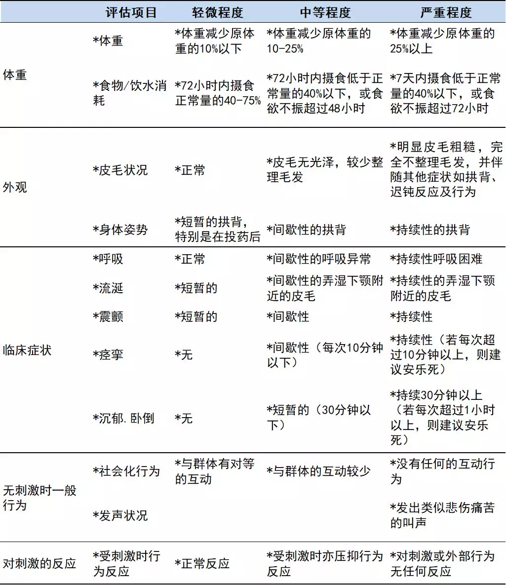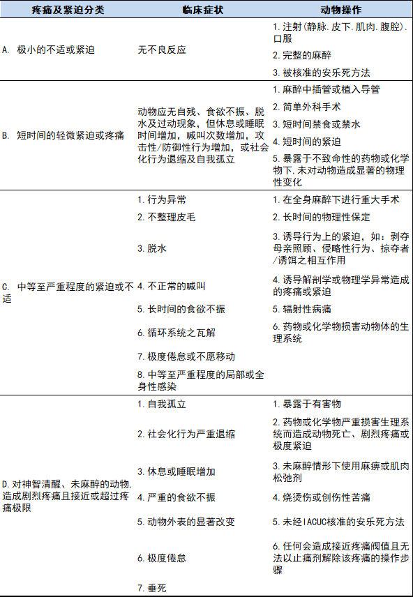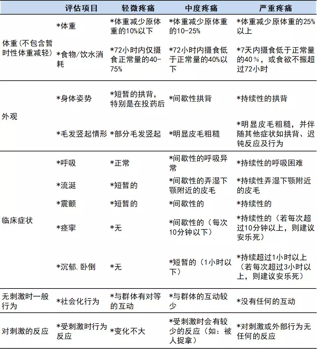 疼痛管理是动物福利的核心内容疼痛源于中枢神经系统,不管是人类和动物都可以感受到疼痛,然而对疼痛之容忍度在不同种动物间、同种动物之不同个体间,都不相同,这种现象亦适用于人类。识别并降低实验动物疼痛一直是动物实验的“3R”原则的重要内容,即减少(Reduction)动物的使用数量,以无感知的实验材料替代(Replacement) 动物如离体器官实验、细胞功能试验等,以及优化(Refinement)实验设计将疼痛和痛苦降到最低。除了基于伦理的考虑外,应激下的实验动物产生的疼痛或痛苦也会造成科研数据的偏差。动物疼痛的分类动物疼痛可以分肉体、内脏和神经疼痛,或者是其急性、持续性及慢性疼痛。1. 按照疼痛位置:1) 肉体疼痛:由身体引起(包括皮肤,骨骼,肌肉,筋腱及其他组织);2) 内脏疼痛:由身体内部器官引起(如心脏,肺,消化道和生殖器);3) 神经疼痛:由神经组织产生(脑和脊髓的异常神经活动)。2. 按疼痛的持续时间分类:1) 急性疼痛:在伤害产生时立刻出现,伤口愈合时消失,如给药注射或实验中对组织没有明显伤害的实验如轻微触电等,这种疼痛往往几秒钟到几分钟便会消失;2) 持续性疼痛:往往会持续数天甚至数周;3) 慢性疼痛:则是一种长期的疼痛,可能长达数月至数年,例如骨关节炎或者癌症疾病动物模型。动物痛苦的信号都有哪些呢?兽医无法用人类语言与动物沟通,也无法得知动物的确切主观感受,在1985年,由Moron & Griffiths 建立了一套可作为依据的评估方法,此种方法用了5种数据来评估动物于实验中所可能遭受的疼痛状况,这5种数据包含有:体重、外观、临床症状、先天性的行为及对刺激的反应等[1-2]。一、首先看看动物疼痛的常见症状:• 不清理皮毛(皮毛粗糙无光泽)• 食物及水分摄取量下降、尿液及粪便量减少• 对人类触碰的物理性反应异常(退缩,跛行,异常攻击性,尖叫,夹紧腹部,脉搏和呼吸次数上升)• 体重下降(原体重之20-25% ), 生长停滞(增重迟缓), 或体质改变• 脱水• 体温异常(上升或下降)• 脉搏和呼吸异常(上升或下降)• 磨牙(常见于兔子及大型农场动物),流汗(马)• 自我攻击,自我伤害疼痛部位• 疼痛部位之炎症反应• 惧光• 呕吐或下痢• 器官衰竭之具体证据(血液生化,超音波,肉眼病变等)二、不同实验可能造成的动物疼痛分类表