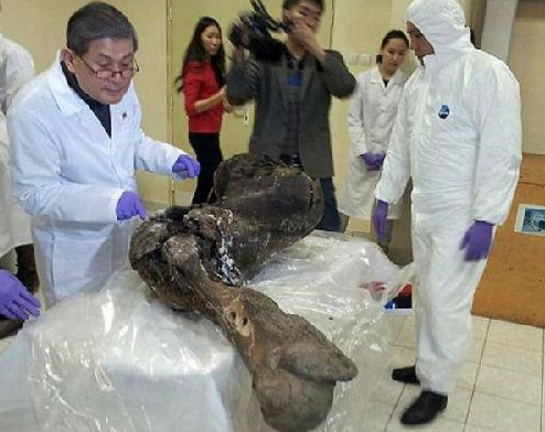 韩国研究人员在仔细观察俄罗斯发现的猛犸象遗骸(英国《每日邮报》网站)