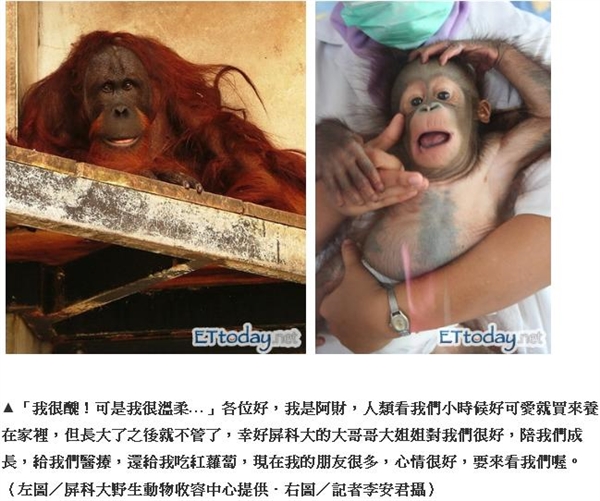 还有观点认为,《奇妙的朋友》这类节目会从一个常人不易想到的方面带来负面影响。即节目越火,大众越可能因此而产生私养宠物的欲望,从而成为推动野生动物贸易的黑手。在台湾就发生过这样的例子,上世纪八十年代,台湾一档颇受欢迎的节目找来一只红毛猩猩幼儿当嘉宾,引发宝岛猩猩热。台湾屏东野生动物保育研究所的教授裴家骐在最近的一个访问里说:“当时进口的红毛猩猩都是襁褓中的幼儿,捕猎者必须杀死妈妈才能进而得到小猩猩;而走私来的小猩猩被藏在船底,当船抵达台湾,死亡率高达75%。” 这一档节目造成的后果对红毛猩猩来说是灾难性的,上面就是台湾媒体关于此事报道的截图。据统计有多达1000只猩猩被成功走私到台湾卖作宠物,多半因为气候不宜或照顾不周,在5年内死掉。更悲剧的是,在这1000只抵达消费者手中的红毛猩猩背后,还有另外4000只猩猩非正常死亡,或者在捕猎过程中被猎人打死,或死在运输途中——这个数字,几乎达到了猩猩属两个物种现存个体数的10%! 看来,人类在想与猩猩交朋友时的确应该深入思考,猩猩愿意以这种“奇妙的方式”与我们成为朋友吗?