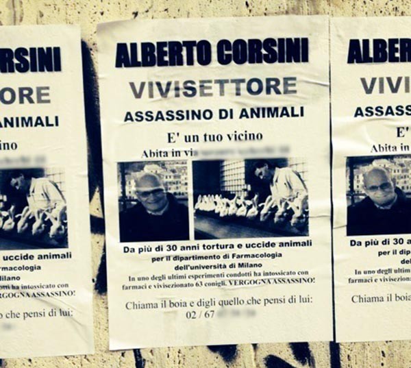 在意大利,有关动物实验的争论出现了令人不快的变化,一位匿名动物保护者张贴出印有米兰大学进行动物实验科学家的照片、家庭住址和电话号码的传单,并给他们打上了“杀人犯”的标签。这些传单引发了学术界和政治界的广泛谴责。这些传单将矛头指向了生理学家Edgardo D’Angelo、寄生虫学家Claudio Genchi、药理学家Alberto Corsini和生物学家Maura Francolini。传单称他们进行动物实验是“有罪”的;Corsini被称“在过去30多年中,虐待和杀死动物”。他的传单以其电话号码和“打电话给这个刽子手,告诉他你是怎么想的”结束。意大利科学家表示,尽管传单没有包含特殊的暴力要求,但暗含恐吓是明白无疑的。为动物实验进行辩护和解释的组织Pro-Test Italia将这场运动与政治迫害联系在一起。Pro-Test Italia主席、生物学家Dario Padovan说:“那些致力于科学和公共健康的人被称为凶手是不能被接受的,有些人公然煽动对他们的暴力迫害。”一些政治家也对这一策略表示谴责。意大利教育、大学和研究部部长Maria Chiara Carrozza说:“我希望对米兰研究人员遭到的恐吓和威胁表达最恳切的慰问,并且我也支持他们。”米兰大学也已经提起诉讼,该市的警察部门也开始进行调查。该校校长Gianluca Vago说:“我们将加强我们的承诺,即保护那些作为改进认知和治疗病人工具的研究。”米兰大学校长Genchi表示,他并不害怕,但是这些攻击让他感到“不舒服”,他提到这些攻击来自“无知的狂热者”。动物研究在意大利一直是争论激烈的话题。一些人希望意大利政府能很快通过一个法案,严格限制动物实验,这引起科学界的强烈不满。去年12月,一名25岁的博洛尼亚大学兽医学学生在博客中贴出为动物实验辩护的言论,这引发了各方骂战。这个学生患有4种遗传病,如果没有动物实验,她写道,“我9岁的时候就已经死去了。”