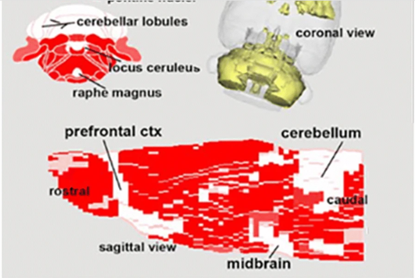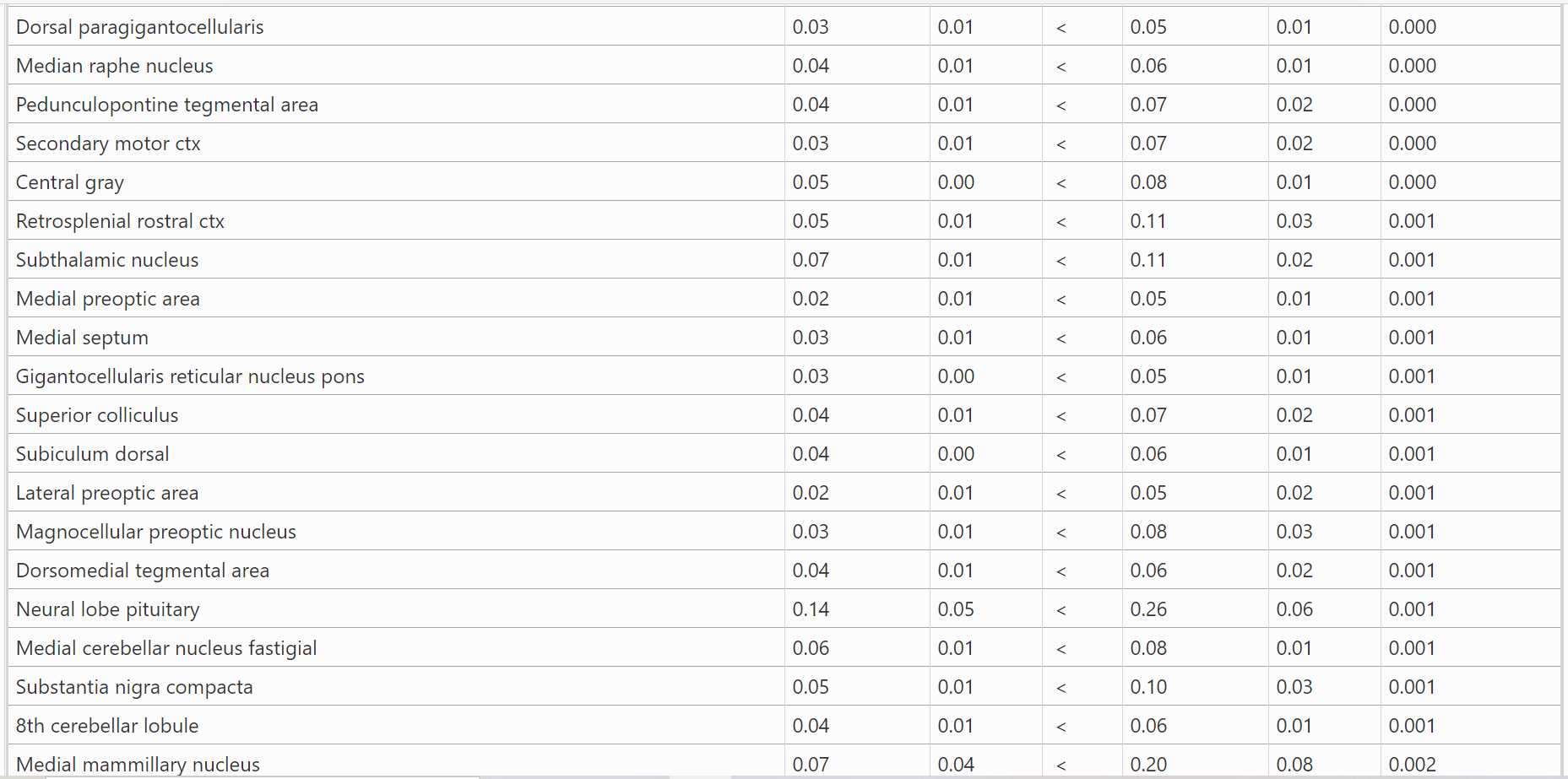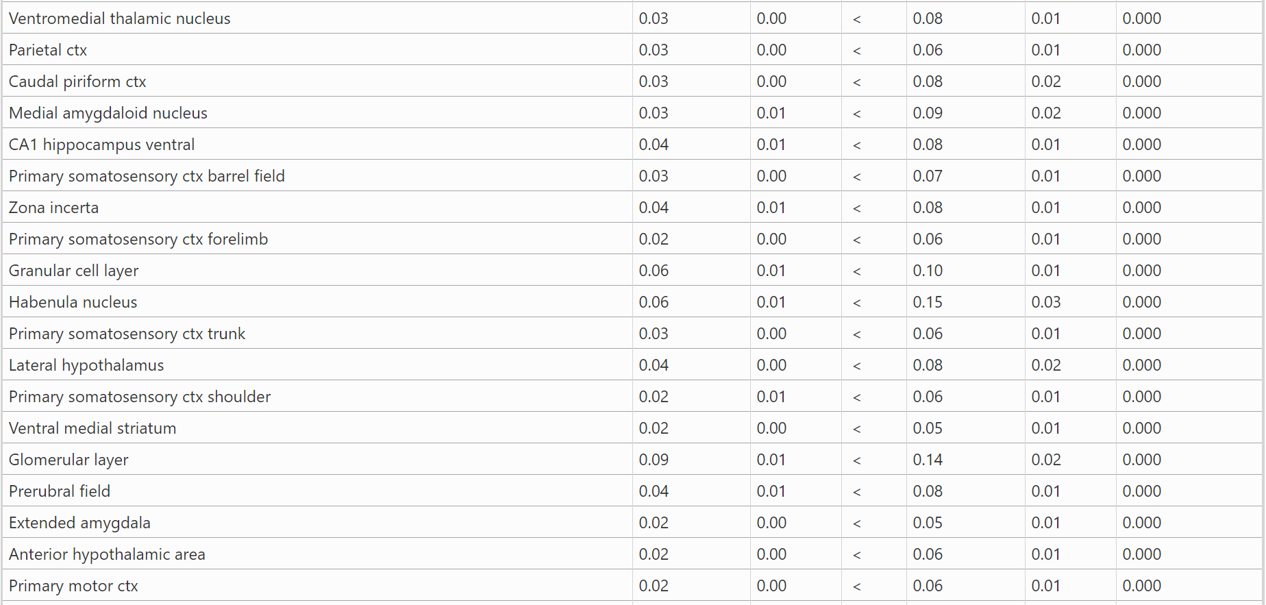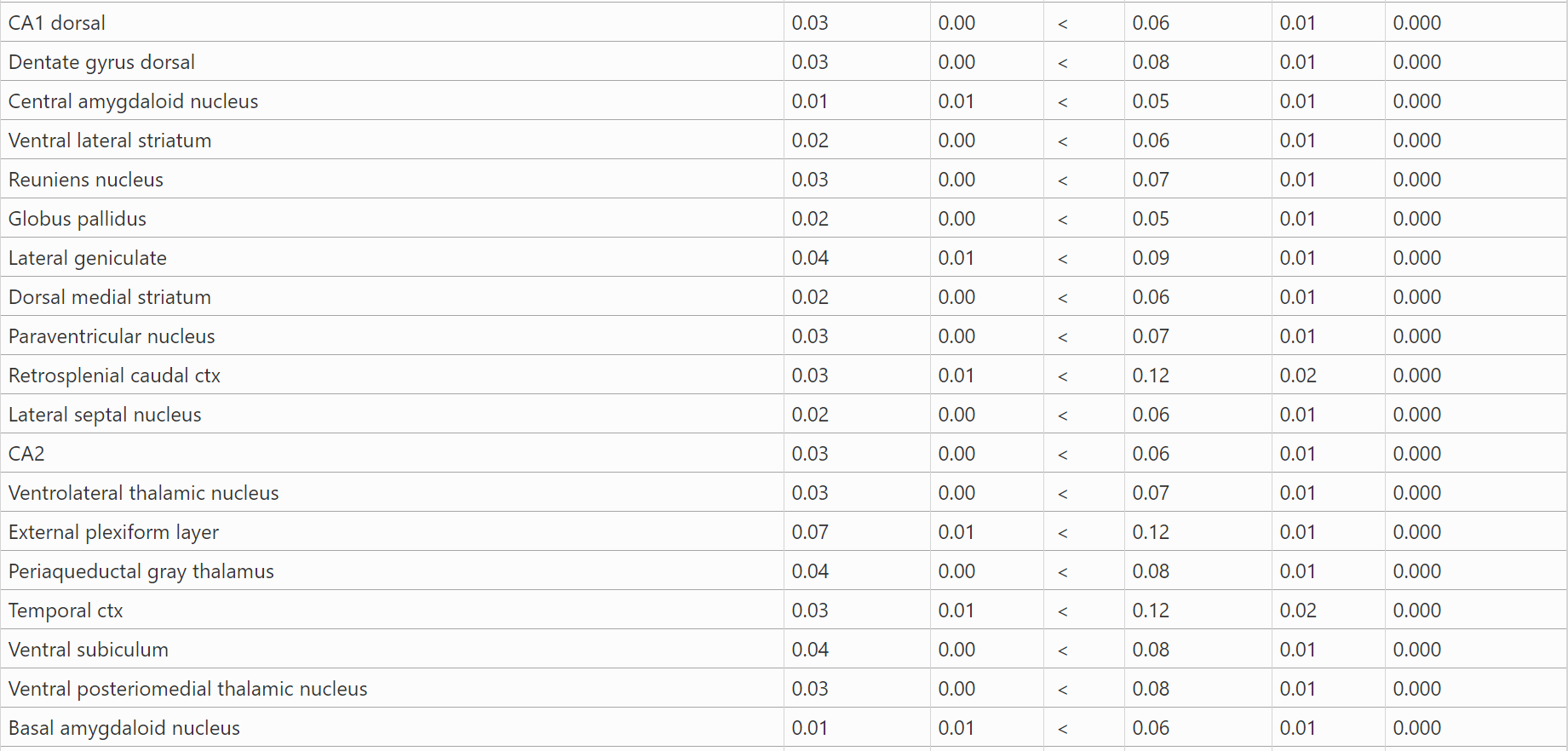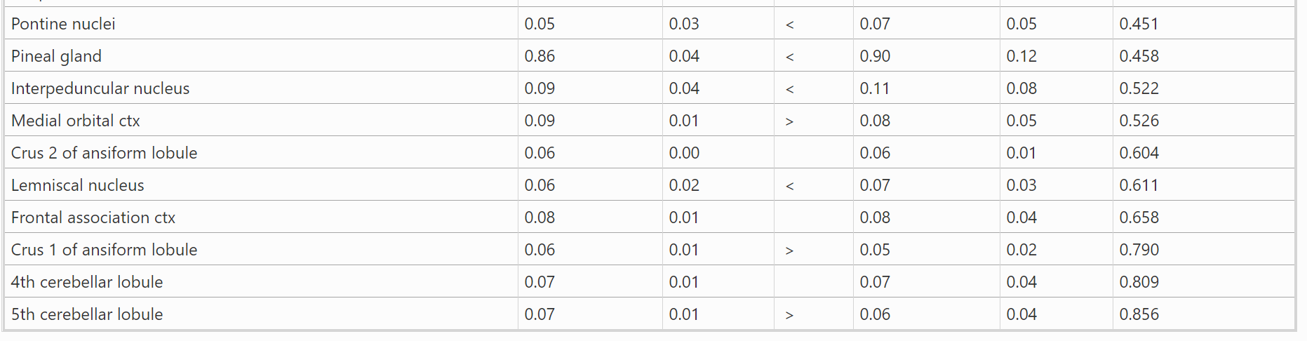 结果:表1显示了BBZDR/Wor大鼠与其同窝对照组之间血脑屏障通透性显著不同的所有脑区(147/173)。注:在所有病例中,BBZDR/Wor大鼠表现出更大的通透性。这些区域的位置可以在图1所示的大鼠MRI图谱生成的周围2D和3D图像中可视化。与对照组相比,BBZDR/Wor大鼠的2D图像中所有红色区域的血脑屏障通透性都显著增加。表2显示了BBZDR/Wor大鼠与其同窝对照组之间血脑屏障通透性无显著差异的所有脑区(26/173)。这些以白色显示的区域位于额叶ctx,中脑和小脑。 这些未受影响的区域在大脑中以黄色显示。