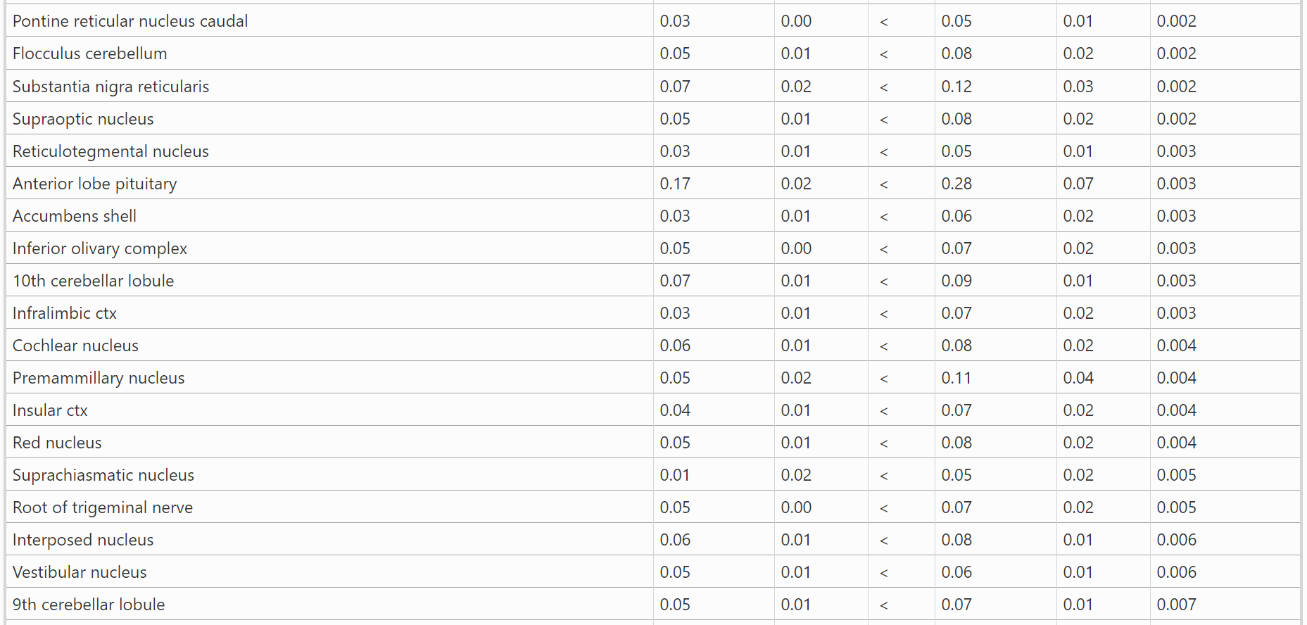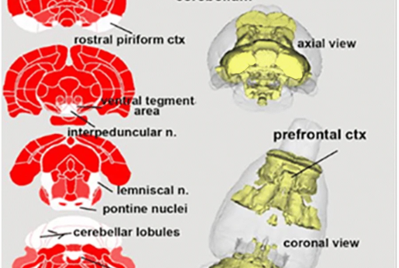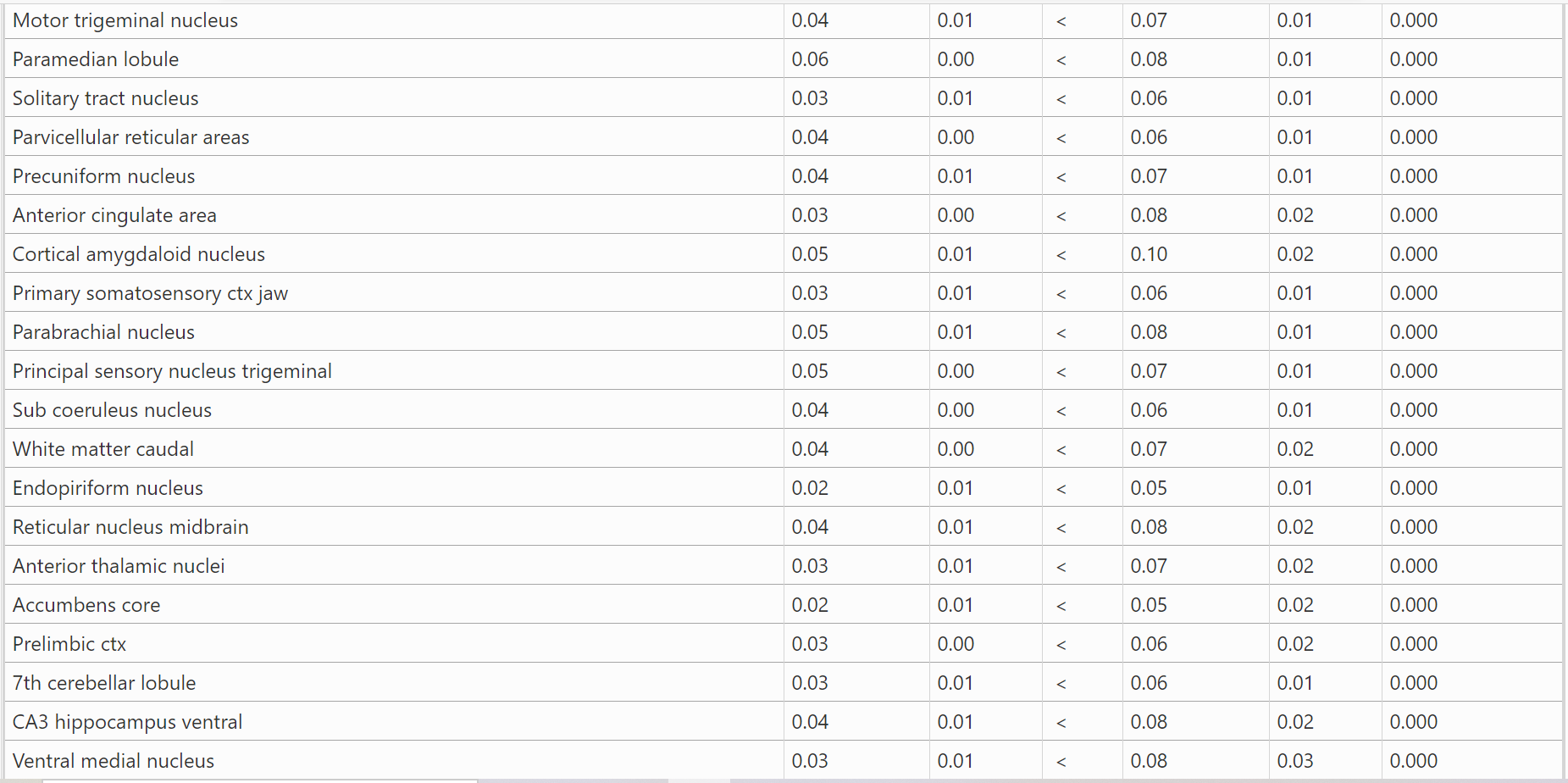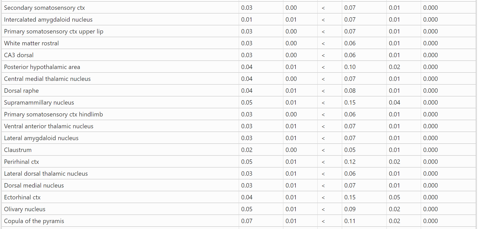 结果:表1显示了BBZDR/Wor大鼠与其同窝对照组之间血脑屏障通透性显著不同的所有脑区(147/173)。注:在所有病例中,BBZDR/Wor大鼠表现出更大的通透性。这些区域的位置可以在图1所示的大鼠MRI图谱生成的周围2D和3D图像中可视化。与对照组相比,BBZDR/Wor大鼠的2D图像中所有红色区域的血脑屏障通透性都显著增加。表2显示了BBZDR/Wor大鼠与其同窝对照组之间血脑屏障通透性无显著差异的所有脑区(26/173)。这些以白色显示的区域位于额叶ctx,中脑和小脑。 这些未受影响的区域在大脑中以黄色显示。