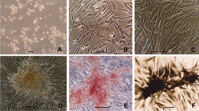 图2、A原代骨髓间充质干细胞;B第3代骨髓间充质干细胞形态均匀;C成骨培养液诱导的融合MSCs可见细胞内屈光颗粒;D诱导3周后,MSCs融合形成钙化结节;E茜素红染色证实成骨诱导的MSCs形成钙化结节;F 改良Gomori染色法观察成骨分化MSCs的ALP表达。比例尺 = 100μm