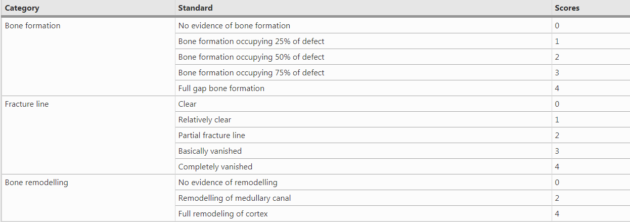 X射线检查:分别于术后4、8、12周行x射线分析。通过X射线获得肩胛骨的前后视图。 所有射线照相结果均在随机和双盲条件下进行评估。评分如下表: