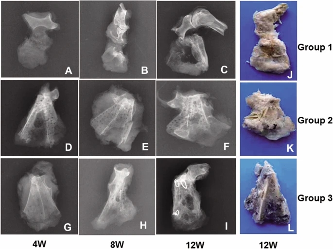 图4、X射线和宏观观察。第一行(A–C)分别代表第1组4周、8周和12周肩胛骨缺损修复的X光片。第2行(D-F)分别为第2组4、8和12周肩胛骨缺损修复的X线片。第3行(A-C)分别为第3组4、8和12周肩胛骨缺损修复的X线片。第4栏(J–L)分别代表第1组、第2组和第3组在12周时肩胛骨缺损修复的宏观视图。
