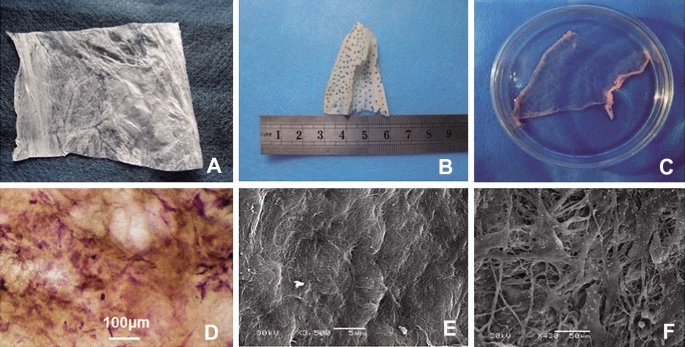 图3、骨缺损的植入物。 A SIS的宏观表现;B 肩胛骨块衍生的DPB的宏观外观;C 培养的TEP的宏观外观;D 光镜下贴附于TEP上的接种细胞,HE染色可见(比例尺 = 100μm); E 扫描电镜观察SIS;