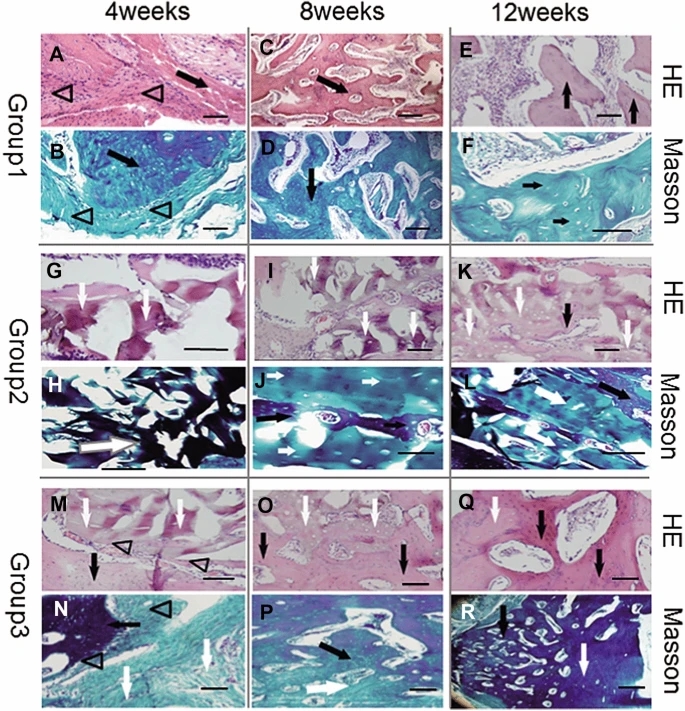 图5、在光学显微镜下用HE(第1、3和5行)和Masson三色(第2、4和6行)染色进行组织学检查。 在第1组(第1行,第2行)中,TEP在第4周形成了岛状骨痂(A,B)。 新生骨组织增加,血管不规则或骨髓腔未成熟,而TEP在8周时消失(可能降解)(C,D)。第12周时,新生骨全部发育成成熟松质骨(E,F)。第2组(第3、4行),第4周(G,H)DPB主要被瘢痕组织和浸润淋巴细胞包围,第8周(I,J)或12周(K,L)伴有少量新骨组织形成。在第3组(第5、6行)中,TEP和DPB之间有少量的新骨形成,这些骨在4周时伴随疤痕组织降解(M,N)。 新的骨组织在第8周(O,P)形成编织骨,而在第12周则倾向于形成成骨细胞嵌入矿物基质的成熟层状骨(Q,R)。 三角形代表TEP,黑色箭头代表新形成的骨组织,白色箭头代表DPB的残留物。 比例尺= 1 mm。