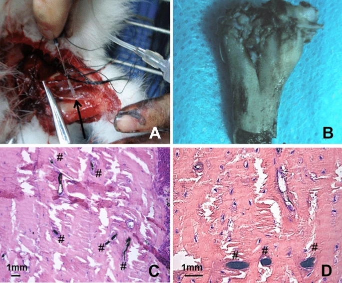 图6、甲醛墨汁灌注。A 腋动脉灌注手术黑箭头指向腋动脉;B 墨汁灌注后骨块的宏观外观。C 黑色微血管,填充有黑色墨水,在纵向区域中可见条纹,在横截面中则为圆形圆点。D“#”代表墨水填充的微血管;比例尺 = 1mm