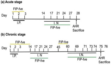 图1、急性和慢性OVA致敏方案 雌性小鼠在急性期(图1a)或慢性期(图1b)腹腔注射50μg与氢氧化铝混合的OVA,鼻内滴入100μl的5%OVA 。在乙酰甲胆碱激发后的第28天或第76天,在所有实验组中均测定气道AHR。为评价FIP-fve对减轻小鼠肺部炎症和改变免疫微环境的作用,致敏小鼠给予FIP-fve。治疗组灌胃给予FIP-fve(200μg/只/天)。