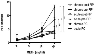 结果:急性期与慢性期AHR与FIP-fve效应的差异:变应原成功诱导了急慢性哮喘动物模型。急性期和慢性期小鼠通过0、5、10mg乙酰胆碱致敏均无显著性差异。在急性期和慢性期小鼠通过20mg乙酰胆碱致敏有显著性差异。慢性期AHR值较高。此外,用FIP-fve治疗的致敏小鼠不仅在急性期,而且在慢性期也有改善。