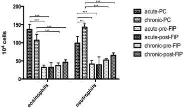 肺部浸润细胞急性和慢性期的差异和FIP-fve效应:急性和慢性哮喘阶段的标志是炎性细胞(如嗜酸性粒细胞和中性粒细胞)渗透到肺中。BALF用于评估肺的细胞浸润,并计数嗜酸性粒细胞和中性粒细胞。结果显示,在急性和慢性期OVA致敏小鼠的肺部浸润性炎症细胞显著增加。急性期嗜酸性粒细胞明显高于其他期。慢性期中性粒细胞明显高于其他阶段。FIP-fve治疗组肺浸润细胞明显减少,不仅嗜酸性粒细胞减少,而且急性期和慢性期的中性粒细胞也明显减少。