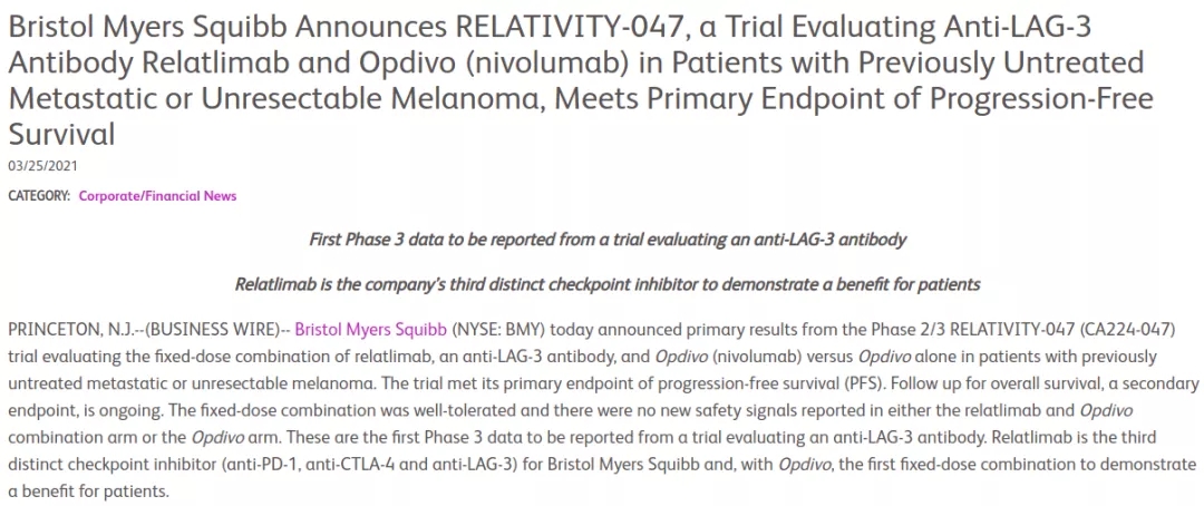 2021年3月25日,百时美施贵宝(Bristol Myers Squibb,BMS)公司宣布其抗LAG-3单抗relatlimab联合抗PD-1单抗Opdivo(nivolumab)的组合疗法,在评估未经治疗的转移性或不可切除性黑色素瘤患者的II/III期临床试验RELATIVITY-047(CA224-047)中,相比 Opdivo单独用药可显著改善患者的无进展生存期(progression-free survival,PFS),试验达到主要终点。这是全球首个抗LAG-3抗体的临床III期数据。