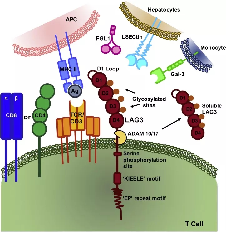 LAG-3还有两个可能的配体LSECtin和Galectin-3,它们可以与LAG-3上的聚糖相互作用。LSECtin属于C-型凝集素,主要在肝脏表达,此外,多种肿瘤细胞会高表达LSECtin,包括黑色素瘤、膀胱癌和胰腺癌。Galectin-3是半乳糖苷粘连蛋白,在多种细胞及恶性肿瘤细胞中均有表达,包括肿瘤微环境中的基质细胞和CD8+ T细胞。