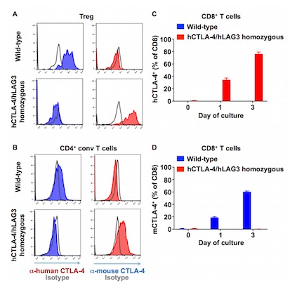 图1. hCTLA-4在hCTLA-4/hLAG3 小鼠中的表达模式与mCTLA-4在野生型小鼠中的表达模式一致。