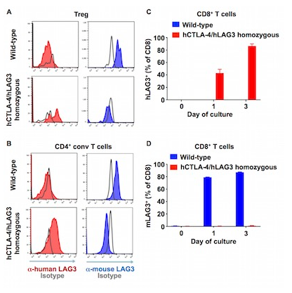 图2. hLAG3 在hCTLA-4/hLAG3 小鼠中的表达模式。