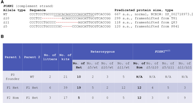 为了建立FOXN1基因缺失兔作为研究资源,首先培育了两只F0兔并与WT繁殖了F1代动物,评估种系传播能力。两只F0代均证明自己是可育的。总共21个子代中有10个(47.6%)是杂合的FOXN1突变体(FOXN1 +/-)。 在这10个中,有2个带有Δ5,3个带有Δ10,而5个带有Δ11突变等位基因。接下来,我们证明了FOXN1+/-兔(即wt/Δ5、wt/Δ10或wt/Δ11)可用于建立和维持裸兔群体。所有F1代FOXN1 +/-兔子,无论其特定的突变类型如何,都是健康的,并且与野生型动物在表型上没有区别,并且可以成功地安置在常规动物设施中。迄今为止,我们已经通过F1 FOXN1 +/-动物的杂交繁殖产生了6窝。总共产生了39个子代,包括8 个WT(21%),19个 FOXN1 +/-(49%)和12个 FOXN1null(30%),接近孟德尔分布。我们还测试了FOXN1null兔是否有生育能力,是否可以用于群体维持。在一次试验中,一只成年FOXN1Δ11/Δ11雄性与三只FOXN1wt/Δ11雌性共育17个个体,其中12个为FOXN1Δ11/Δ11,5个为FOXN1wt/Δ11。通过口服预防性抗生素和加强饲养卫生措施,FOXN1null兔可以活1年以上。