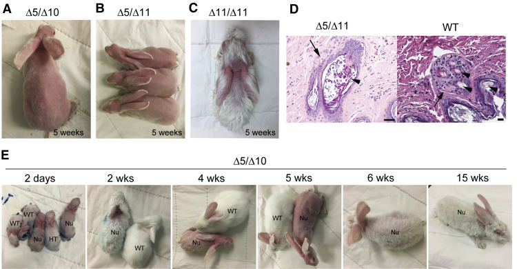 (A–C)5周龄时不同基因型的NuRabbits。 (A)Δ5/Δ10,(B)Δ5/Δ11,(C)Δ11/Δ11。(D)Δ5/Δ11NuRabbit(左)和WT兔(右)中毛囊的代表性显微照片。NuRabbit的皮肤部分(左)的特征是扩张的滤泡性口(箭头),其中包含不同量的角蛋白碎片或不规则的毛干,伴有滤泡上皮变薄以及滤泡中皮脂腺的数量和大小减少(箭头) 与WT兔子(右)的毛皮肤相比,WT兔子的毛皮肤具有发达的皮脂腺单位(箭头)和多个毛囊,每个附件都有完整的毛干(箭头)。