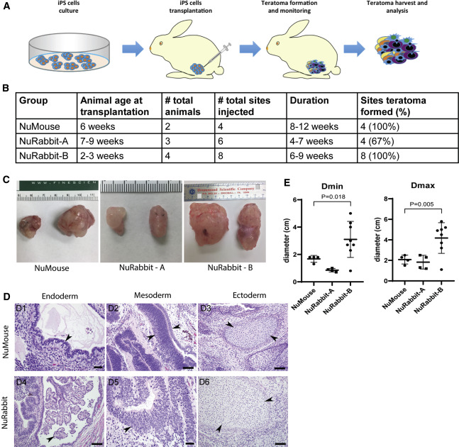 利用两个不同年龄组的七只动物。植入iPSC时,A组(n=3)NuRabbits(NuRabbits-A)为7-9周龄,B组(n=4)NuRabbits(NuRabbits-B)为2-3周龄。每只NuRabbit的后腿肌肉注射1×106个iPSCs。对照组采用6周龄裸鼠(n=2),每只后腿接受1×106个iPSCs。在实验终点,安乐死后切除肿瘤,并测量每个畸胎瘤的最长轴(Dmax)和最短轴(Dmin)的长度作为畸胎瘤大小的指标。在A组中,畸胎瘤在两只动物的所有四个注射部位中生长,但在第三只动物的两个注射部位中没有生长(4 / 6,67%)。相比之下,B组动物在8个注射部位中有8个畸胎瘤生长(100%),表明2-3周龄的NuRabbits可能比7-9周龄的NuRabbits更适合iPSC畸胎瘤生长。此成功率与对照组NuMice组的成功率相似,在该组中,两只动物的所有四个注射部位都有畸胎瘤生长(100%)。