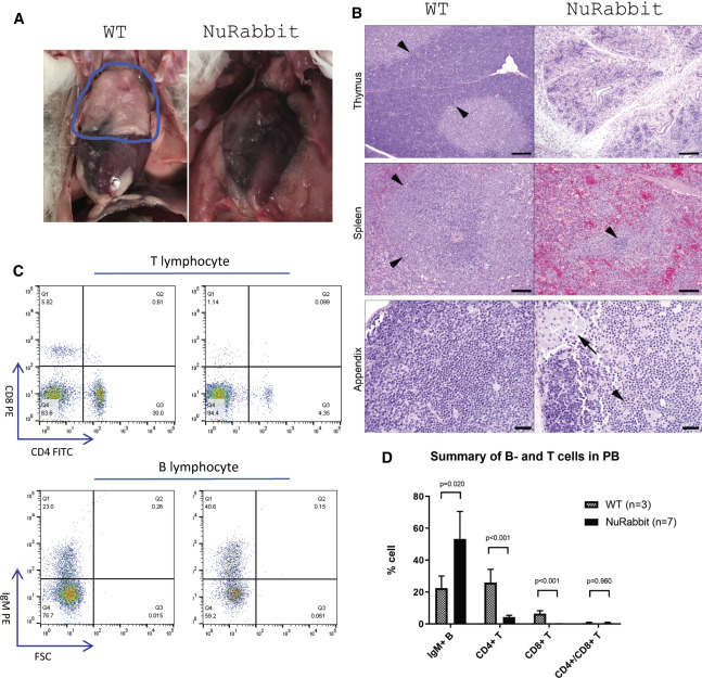 (A) NuRabbits胸腺发育不足(右),而野生型兔胸腺发育正常(蓝色圆圈)。(B)与NuRabbits(右)相比,野生型兔的胸腺(bar,100μm),脾(bar,50μm)和阑尾(bar,20μm)的切片。与WT兔胸腺皮质淋巴区(箭头)相比,NuRabbits的淋巴成分明显减少,胸腺小叶疏松结缔组织基质中仅残留少量细胞簇。WT兔的脾脏有大的淋巴滤泡(箭头),而NuRabbits的淋巴组织普遍缺乏,只剩下小的残余物(箭头)。在阑尾切片中,WT兔的固有层内有密集的淋巴组织片,相比之下,NuRabbits中淋巴细胞的片状缺失,伴有结缔组织细胞碎片(箭头)和吞噬退化淋巴细胞的巨噬细胞(箭头)。