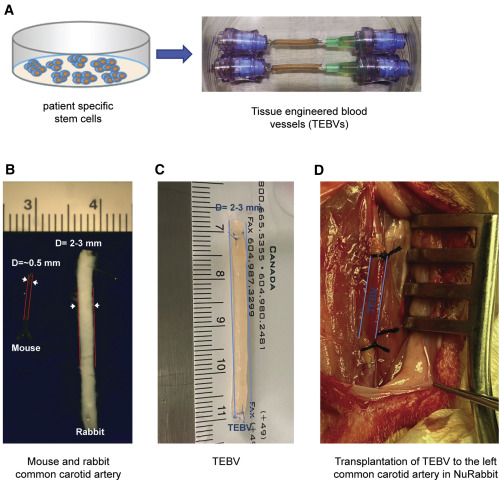图5、TEBV在NuRabbit的移植。 (A) 患者特异性干细胞衍生的TEBV的图示。(B) 成年小鼠(左)和成年兔(右)颈总动脉的代表性图像。(C) TEBV的代表。(D)移植到NuRabbit中的左颈总动脉后的TEBV的代表性图像。