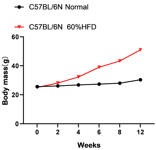 图1. 模型组(60%高脂饲料喂养)和对照组小鼠(普通饲料喂养)体重变化对比。模型组小鼠体重变化显著高于对照组小鼠。HFD,high-fat diet,高脂饮食。