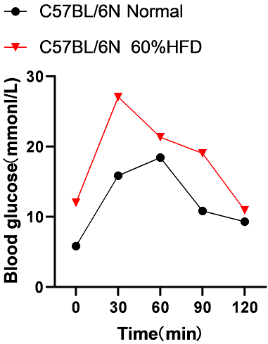 图3. 模型组与对照组的葡萄糖耐受实验,结果表明经60%高脂饲料喂养12周的C57BL/6N小鼠糖耐量显著降低。注:禁食16小时,2g/Kg灌胃葡萄糖溶液。