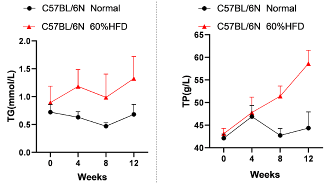 分别检测对照组、高脂饮食喂养4、8、12 周的小鼠血清的肝功能指标:丙氨酸转氨酶(ALT)、天冬氨酸转氨酶(AST)、甘油三脂(TG)、总蛋白(TP)、高密度脂蛋白胆固醇(HDL-C)及低密度脂蛋白胆固醇(LDL-C)。结果发现模型组小鼠血清中总蛋白(TP)、甘油三脂(TG)、低密度脂蛋白胆固醇(LDL-C)、高密度脂蛋白胆固醇(HDL-C)的含量均高于对照组小鼠。