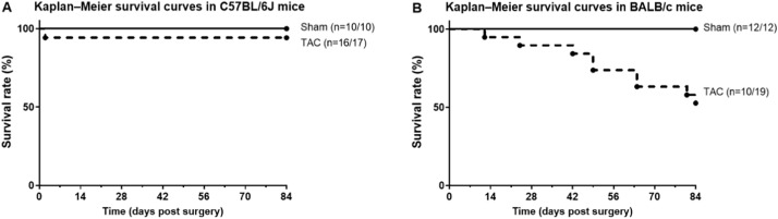 图1. C57BL / 6和BALB / c小鼠主动脉缩窄(TAC)后的Kaplan-Meier生存曲线。