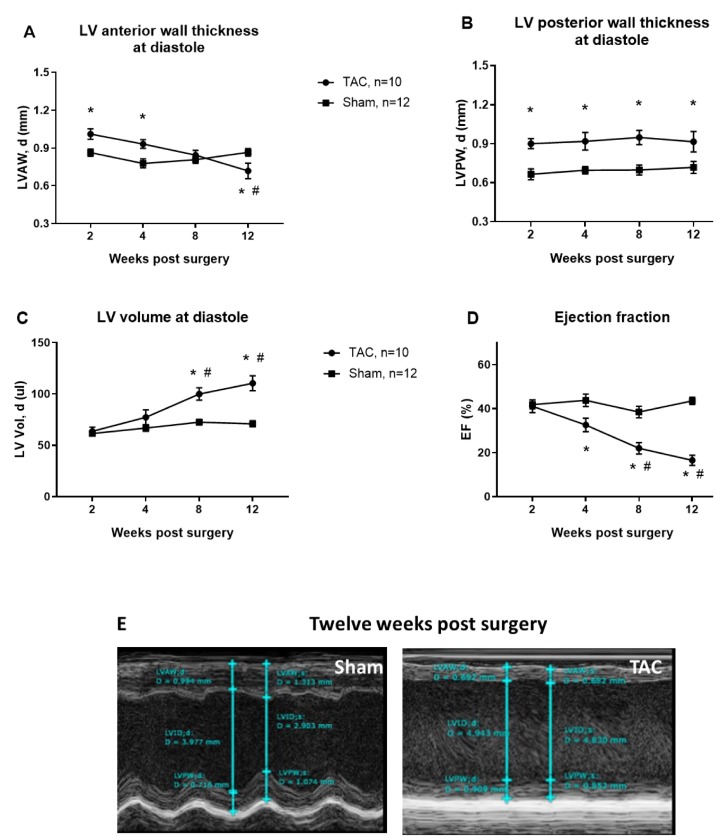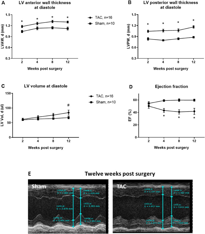 图3、BALB/c小鼠主动脉缩窄(TAC)或假手术后的超声心动图特征。